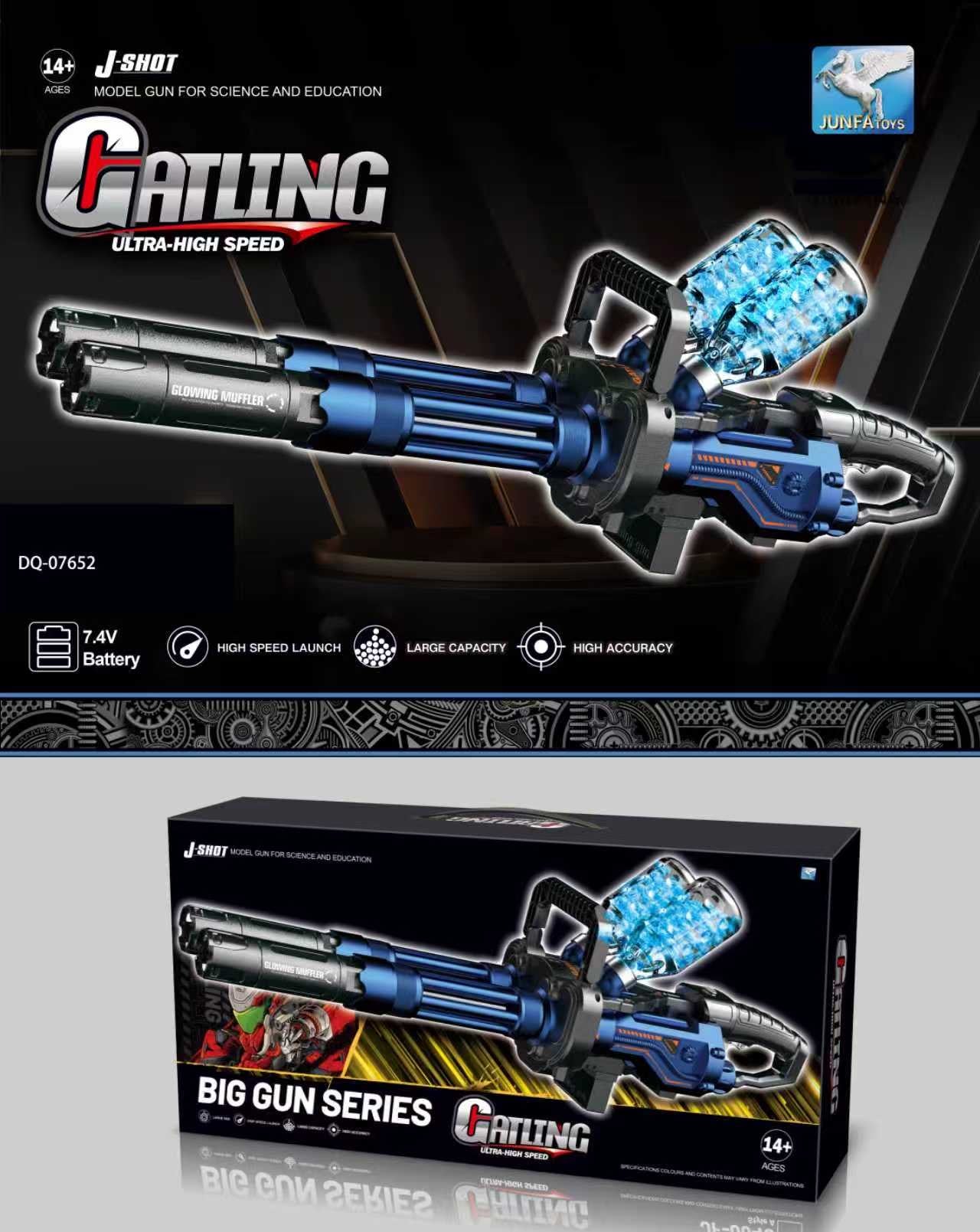 Experience the ultimate fun and power with the JF Rotating Double Barrel Gatling Orbeez Gun with Tracer. This gel gun allows for full automatic shooting mode with two rotatable barrels. The package comes with two tracers, they guarantee glow in the dark shooting fun at night.